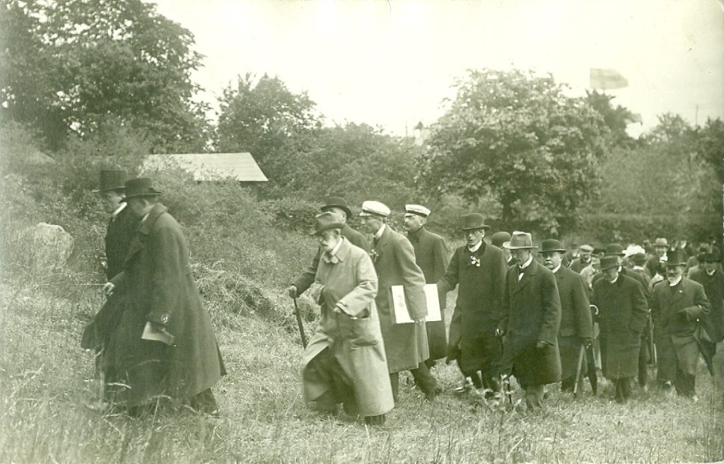 Processionen på väg till grundstensläggningen 16 juni 1916. I spetsen ärkebiskop Nathan Söderblom och biskop J. A. Eklund. Därefter rektor Manfred Björkquist och John Åkerlund med flera.